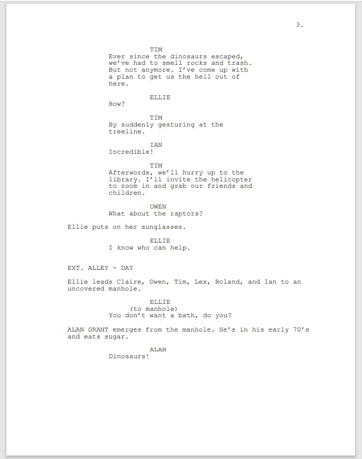 I’ve written about ‘Dominion’ before, and back in 2019 I tried my hand at theorizing how the film might turn out… by taking the scripts for ‘Jurassic Park,’ ‘Jurassic World,’ and ‘Jurassic World: Dominion’ and putting them into a predictive text generator to see what sort of gibberish it would spit out. I originally intended to do dozens of pages of Grant, Ellie, Ian, Owen, and other characters talking nonsense, but real life got in the way and I never finished the project. With the release of the trailer, I figured this would be a good time to post the pages that were finished, if only to give people a laugh at what would have been the most bonkers summer blockbuster ever released. (If the pictures are too small, right click and open them in a new tab.)